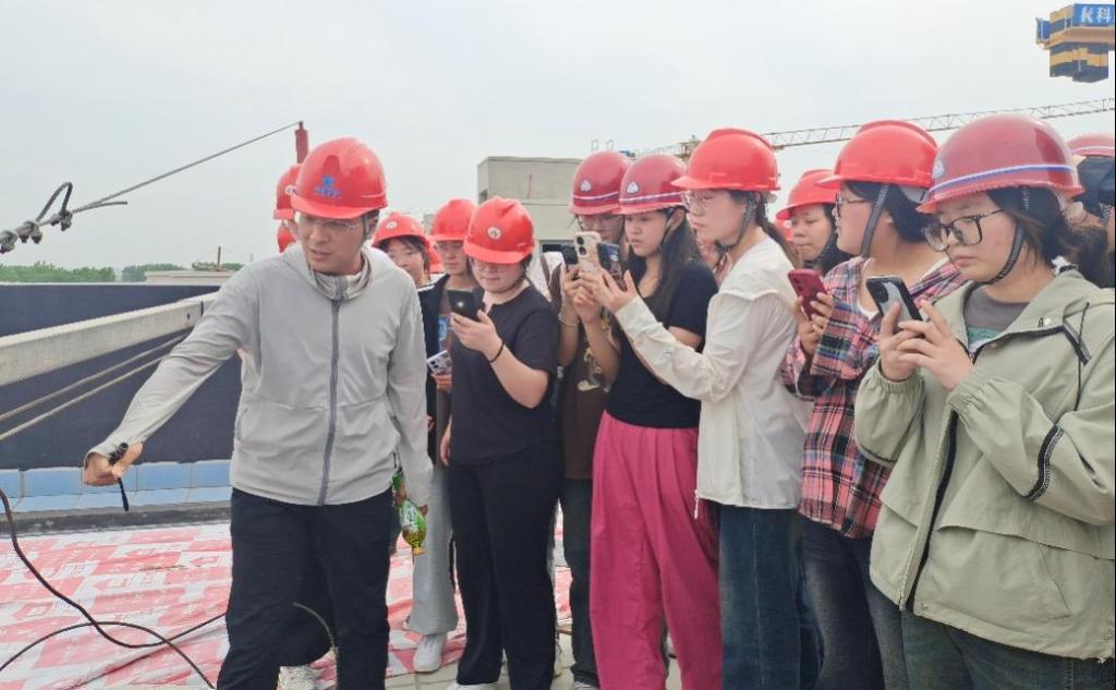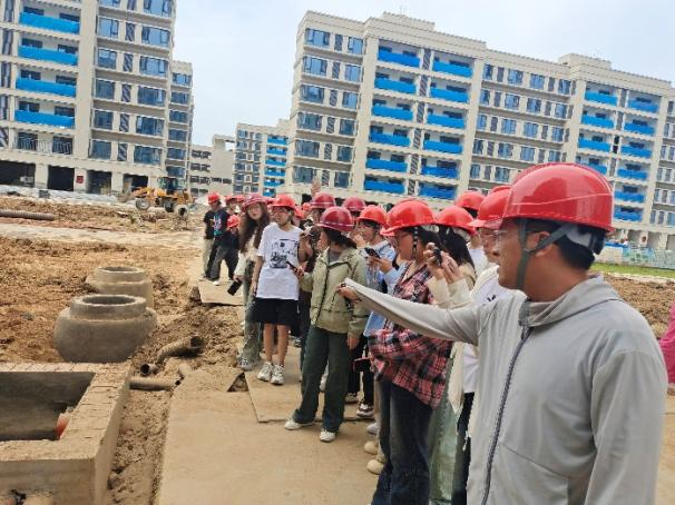 抵达现场后,现场负责人介绍了工程概况,带领同学们参观了正在施工的住宅楼小区,结合现场施工进度,详细为同学们讲解了现场建筑材料、施工机械、绿色施工(洗车台、雾炮机,自动喷淋系统,扬尘监测系统)、填充墙及构造柱的施工工艺、安全文明施工、配电箱、强弱电井、外墙粉刷、外脚手架搭设、屋顶女儿墙、泛水、排水沟、无动力风帽、伸缩缝等实践知识。