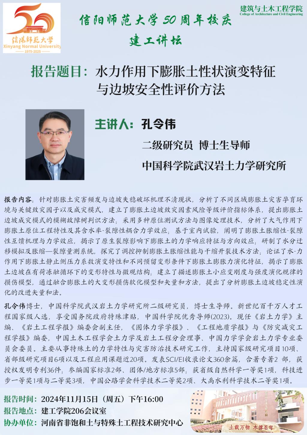 报告人简介:孔令伟博士,中国科学院武汉岩土力学研究所二级研究员,博士生导师。新世纪百千万人才工程国家级人选,享受国务院政府特殊津贴,中国科学院优秀导师(2023)。现任《岩土力学》主编、《岩土工程学报》编委会副主任,《固体力学学报》、《工程地质学报》与《防灾减灾工程学报》,中国土木工程学会土力学及岩土工程分会理事、中国力学学会岩土力学专业委员会委员。主要从事特殊土的力学特性与灾害防治技术研究工作,主持国家级研究项目10项、省部级研究项目6项以及工程应用课题近20项。发表SCI/EI收录论文360余篇,合著专著2 部,获授权发明专利36件;参编国家标准2部、团体/地方标准5部;获省级自然科学一等奖1项,科技进步一等奖1项与二等奖3项,中国公路学会科学技术二等奖2项、大禹水利科学技术二等奖1项。