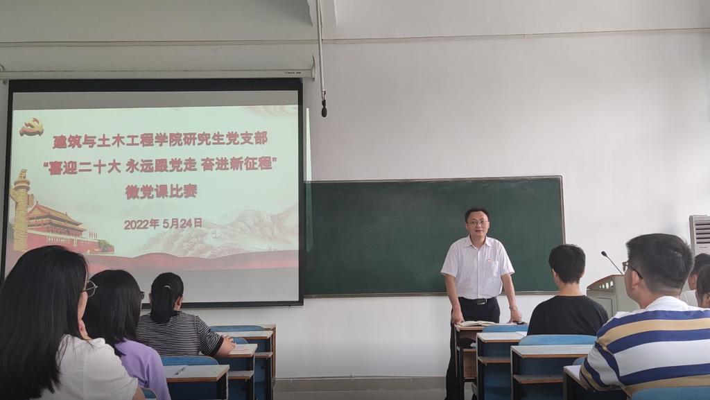为我院研究生党员们能够传承红色基因,赓续精神血脉,引导研究生们继承中国共产党人的优良传统,筑牢理想信念,以实际行动迎接党的二十大胜利召开,我院研究生党支部按照学院的总体部署,以第一批纳入中国共产党人精神谱系的46种伟大精神为专题,于5月24日在综合实验楼308教室开展了“喜迎二十大 永远跟党走 奋进新征程”微党课比赛活动。学院党委书记方明科、副书记冀鹏、专职组织员张海燕、支部全体党员参加活动。