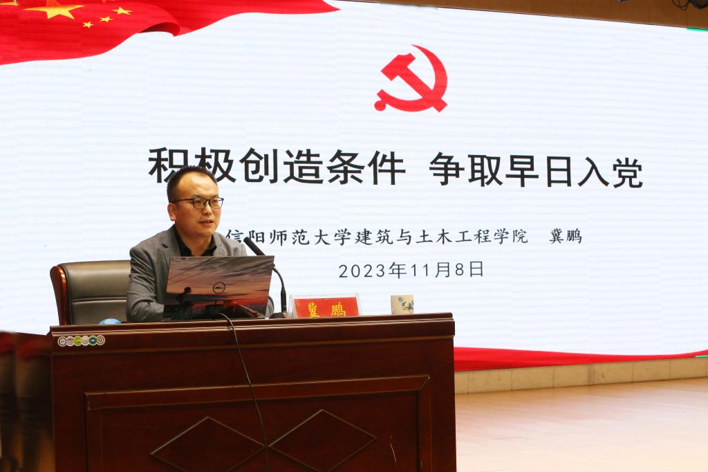 11月8日晚,BEAT365英国官网党委副书记冀鹏应邀在理科楼报告厅为信阳师范大学第40期党员发展对象培训班作《积极创造条件 争取早日入党》专题报告,共有649名党校学员通过线上+线下形式聆听报告。