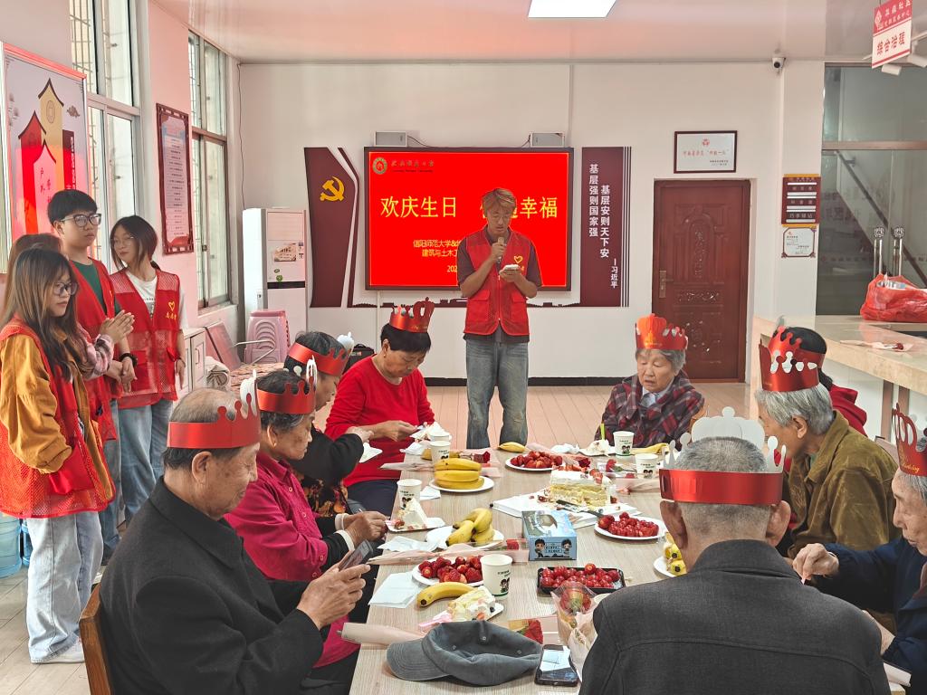学院党员们提前为老人们准备了生日蛋糕和水果,带去了部分生活必需品,与社区工作人员一起布置了场地。集体生日会开始,大家一起为老人们唱生日歌,戴生日帽,送上代表幸福和安康的鲜花。老人们边吃蛋糕、水果,边欣赏由学生党员带来的表演。白浩仪同学的歌曲《精忠报国》,杨颜伊同学的歌曲《少年中国说》,郑艺冉和王隆同学朗诵的《读中国》,都迎来老人们的阵阵掌声。陈韵霓同学带来的手势舞《桃花朵朵开》,以欢快的节奏引得老人们热情互动,拉近了同学们与老人之间的距离,营造了一片和谐友爱的温馨氛围。
