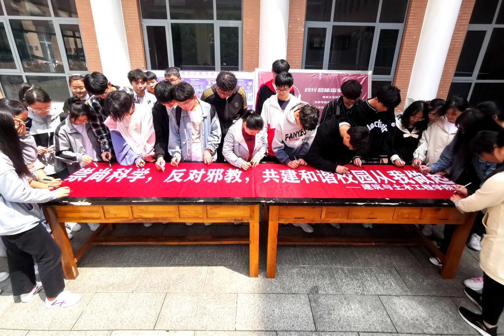 4月15日下午,学院在综合实验楼广场组织开展反邪教警示教育主题活动。活动上,同学们首先观看了《失陷的乐园》等主题教育短片,通过学习视频资料,同学们进一步认清了邪教的本质,从根本上、源头上预防了邪教的滋生,营造了和谐稳定的校园环境。接着,同学们来到综合实验楼小广场,在《反邪教警示教育进校园》主题展板前,学院团委书记张晓博为同学们讲解了大学生受邪教侵害案例,这些案例深深触动了同学们的内心,让他们从更深层次上了解到邪教组织对我们身心健康造成的伤害与影响,帮助他们提升了明辨是非的能力;了解了“法轮功”、“全能神”等邪教组织的本质与骗人的伎俩,树立起自觉抵制邪教渗透的防范意识。最后,同学们在“崇尚科学,反对邪教,共建和谐校园从我做起。”条幅上签下了自己的名字,坚定了做有理想、有信念的新时代大学生,努力把自己锻炼成为社会主义事业的建设者和接班人。(BEAT365英国官网 陈瑜苹)