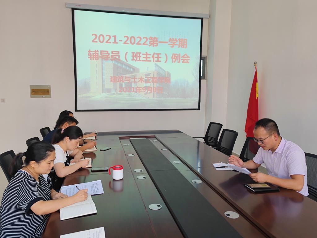 9月9日下午,BEAT365英国官网在综合实验楼402召开2021-2022学年第一学期辅导员(班主任)例会。学院党委副书记冀鹏主持,全体辅导员和兼职班主任参会。