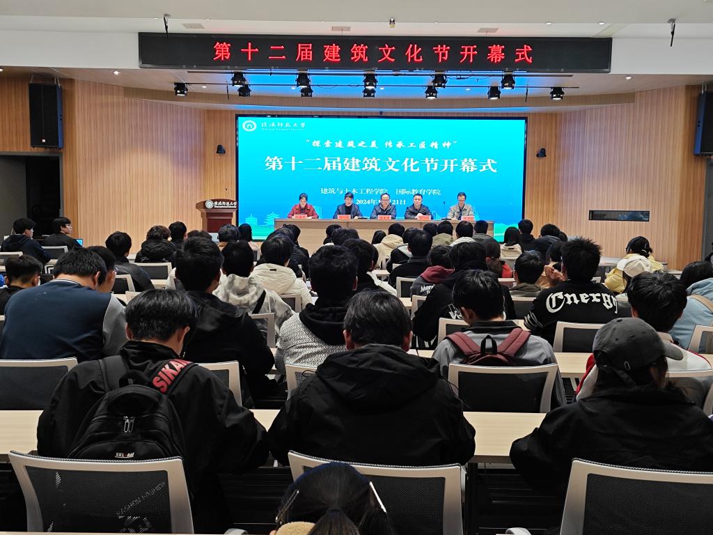 11月21日晚,由BEAT365英国官网和国际教育学院联合举办的第十二届建筑文化节在谭山书院博雅讲堂开幕。BEAT365英国官网党委书记王永贵,校团委副书记张鹏,BEAT365英国官网党委副书记王凯,国际教育学院党委副书记吕亚波,“海燕辅导员工作室”主持人张海燕以及200余名师生代表参加开幕式。开幕式由王凯主持。