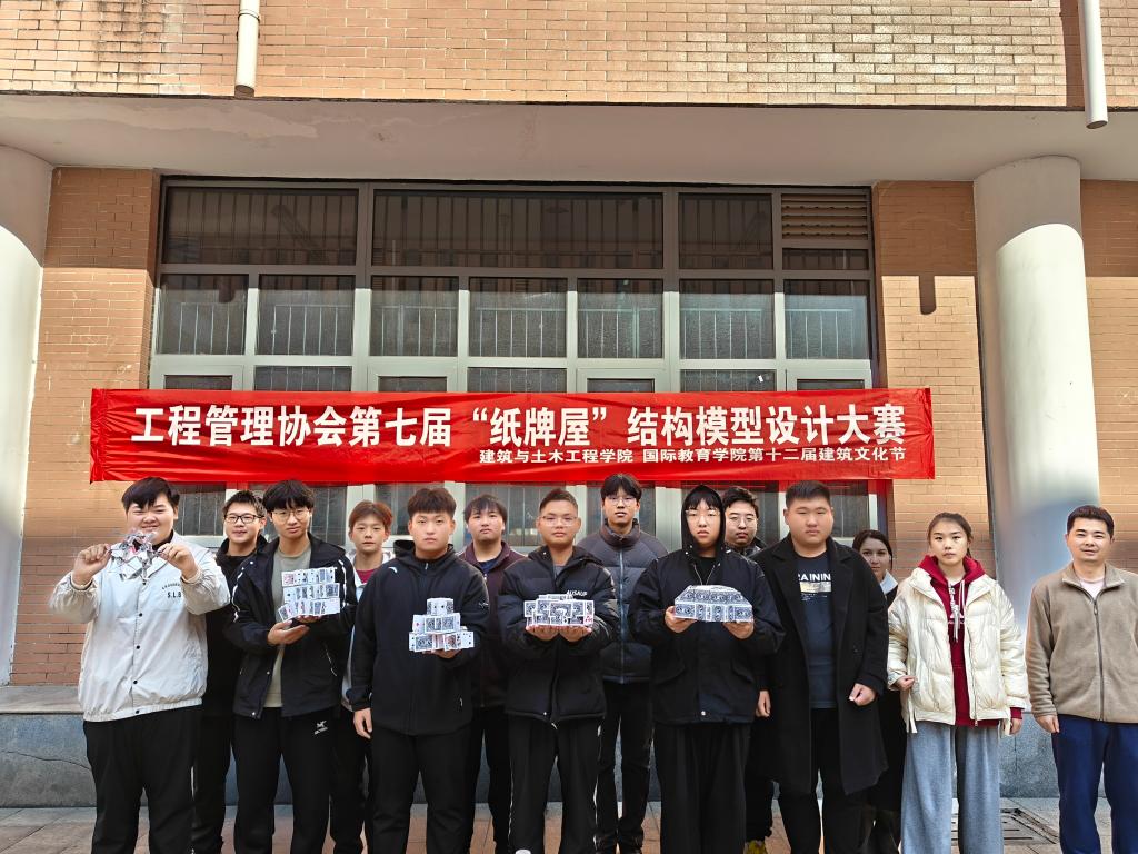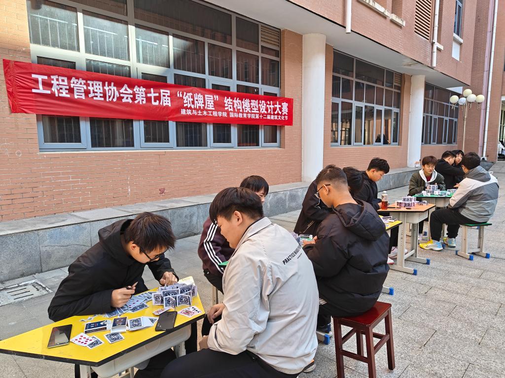 12月1日上午,BEAT365英国官网在综合实验楼小广场举办第七届“纸牌屋”结构模型设计大赛。工程管理协会指导老师吴志强、社团部分学生以及参赛选手参加活动。