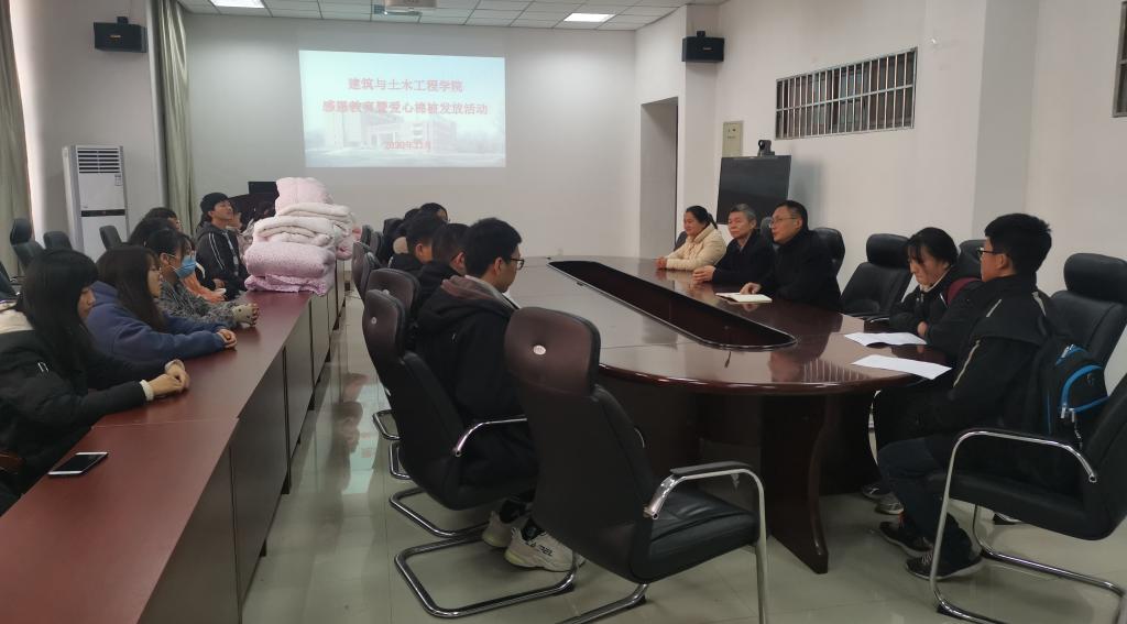 冬日送温暖,资助暖人心,为认真落实学校、学院资助政策,关心关爱家庭经济困难学生,同时做好感恩教育,我院于11月27日上午在综合实验楼206会议室开展了感恩教育暨爱心棉被发放活动。我院党委书记黄学玉、党委副书记方明科、团委书记张晓博、资助专员邓林、国家励志奖学金代表和20级学生代表参加了此次活动。活动由方明科主持。