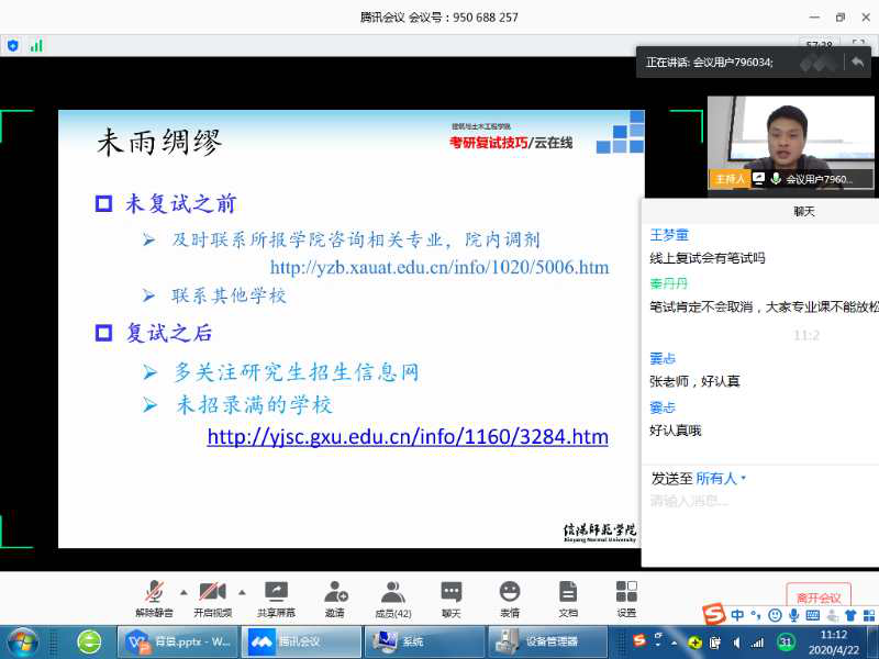 4月22日上午,BEAT365专门利用考研指导群和腾讯会议的形式,组织召开了2020届学生考研复试的“云指导”专题课堂。60余名考研学子参加了本次云上指导会。