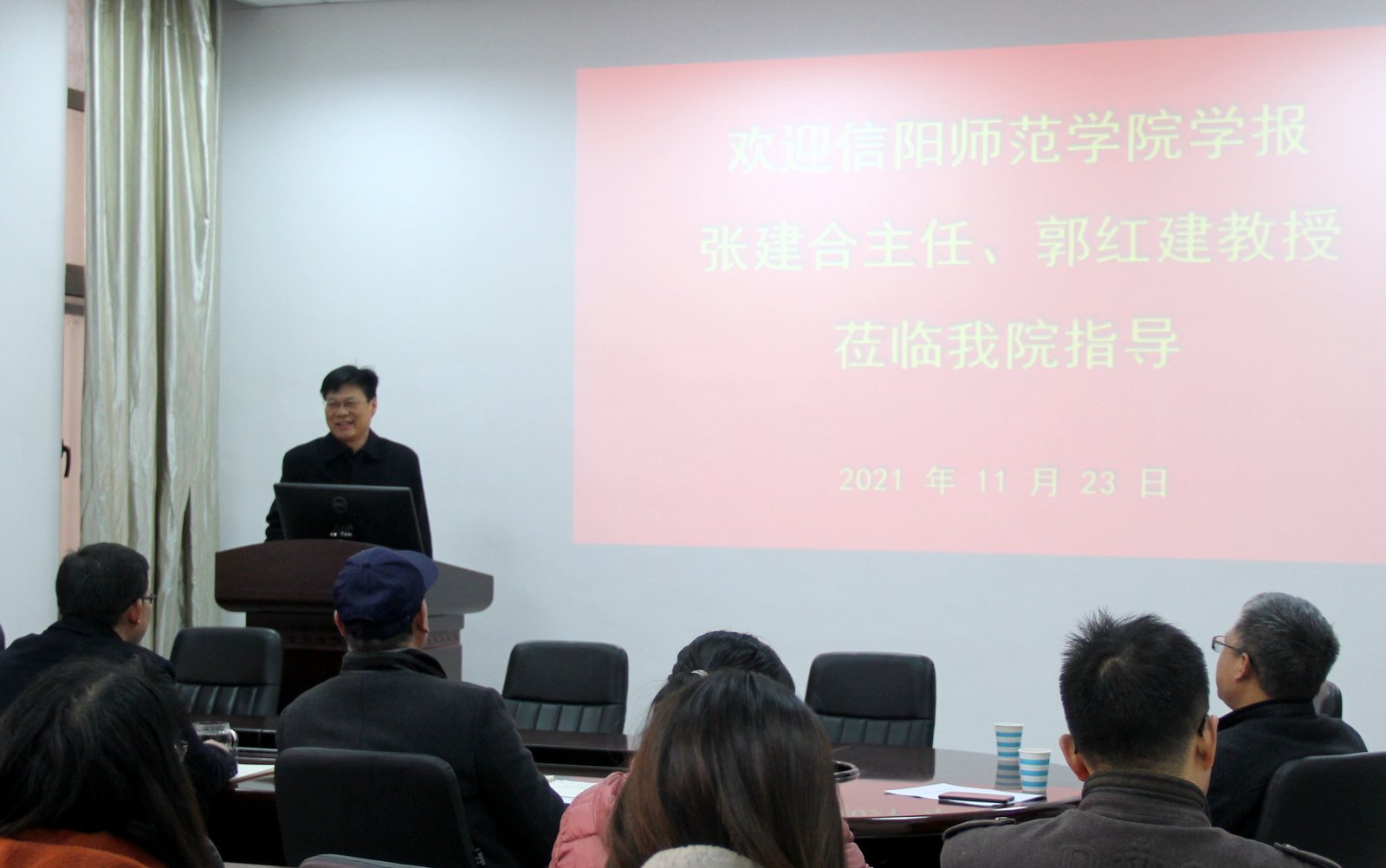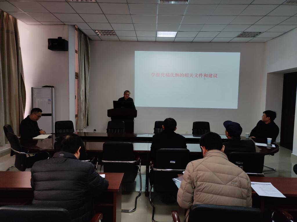 11月23日下午,应BEAT365英国官网邀请,信阳师范学院学报编辑部主任张建合教授、副主任郭红建教授莅临BEAT365,对信阳师范学院学报的办刊情况及相关政策进行了宣讲。学院领导班子全体成员和全体教师参加了此次报告会,会议由党委书记方明科主持。