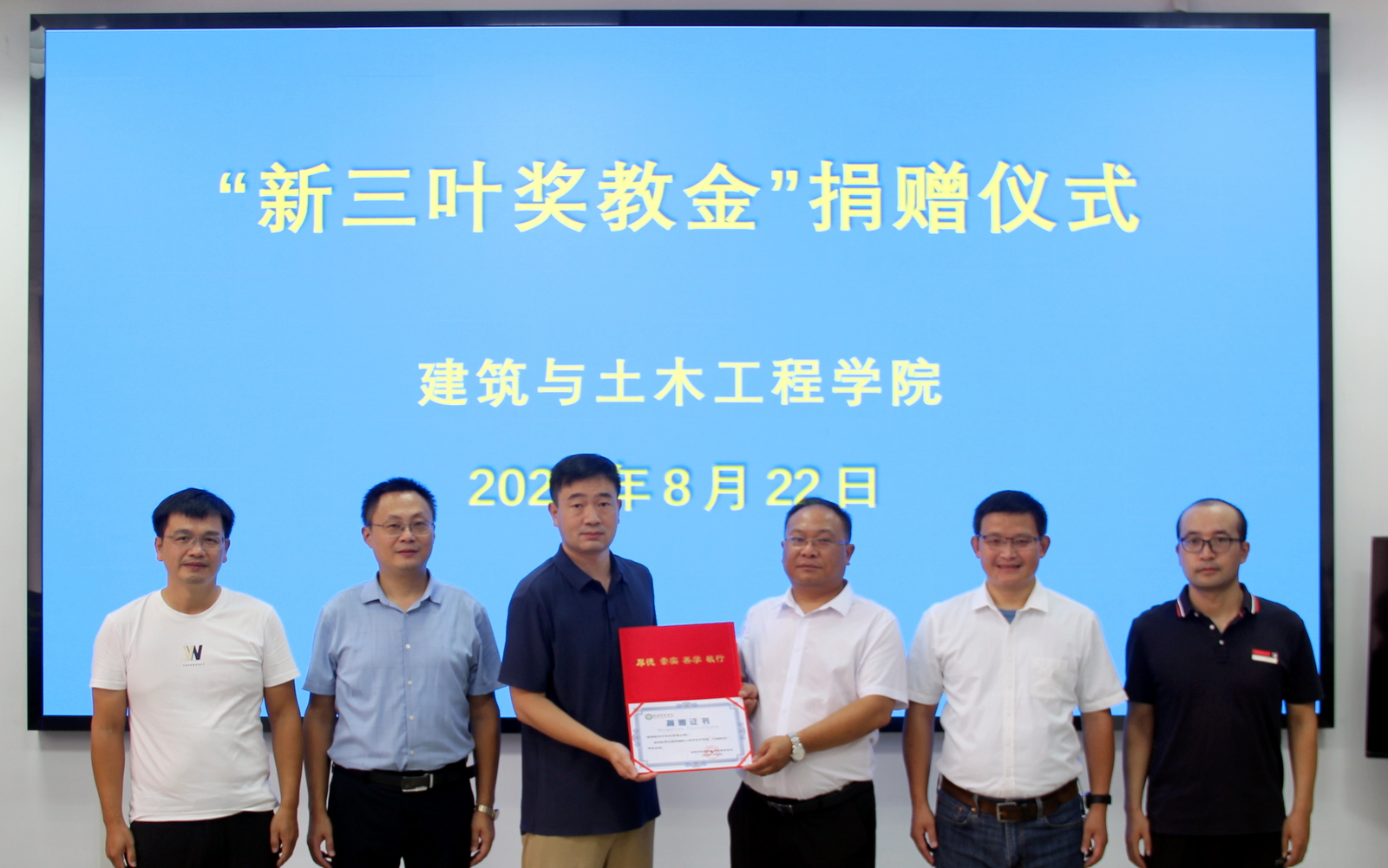 8月22日下午,信阳新三叶科技有限公司奖教金捐赠仪式在BEAT365英国官网206会议室举行。信阳新三叶科技有限公司总经理王锡均、技术经理张云帆,BEAT365党委书记方明科、院长周葆春、副院长肖琪聃、科研秘书马文强参加了捐赠仪式。