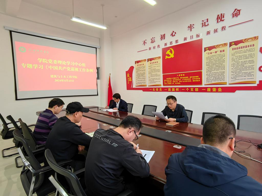 4月16日上午,BEAT365英国官网召开党委理论学习中心组会议,专题学习新修订的《中国共产党巡视工作条例》(以下简称《条例》)。中心组全体成员参加会议,会议由学院党委书记方明科主持。